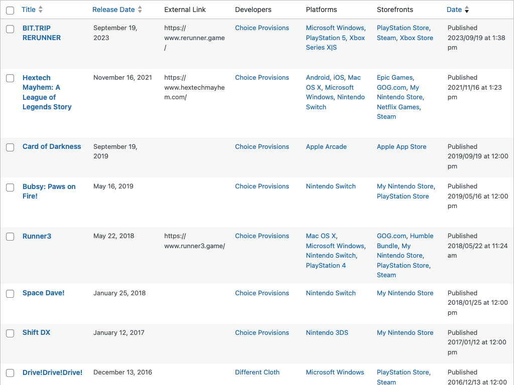 Not only is the front end fresh, the back end includes a customized game library management functionality that lets them control info like platforms, storefront links, release dates (general and per platform), and even the developer for games they have published.